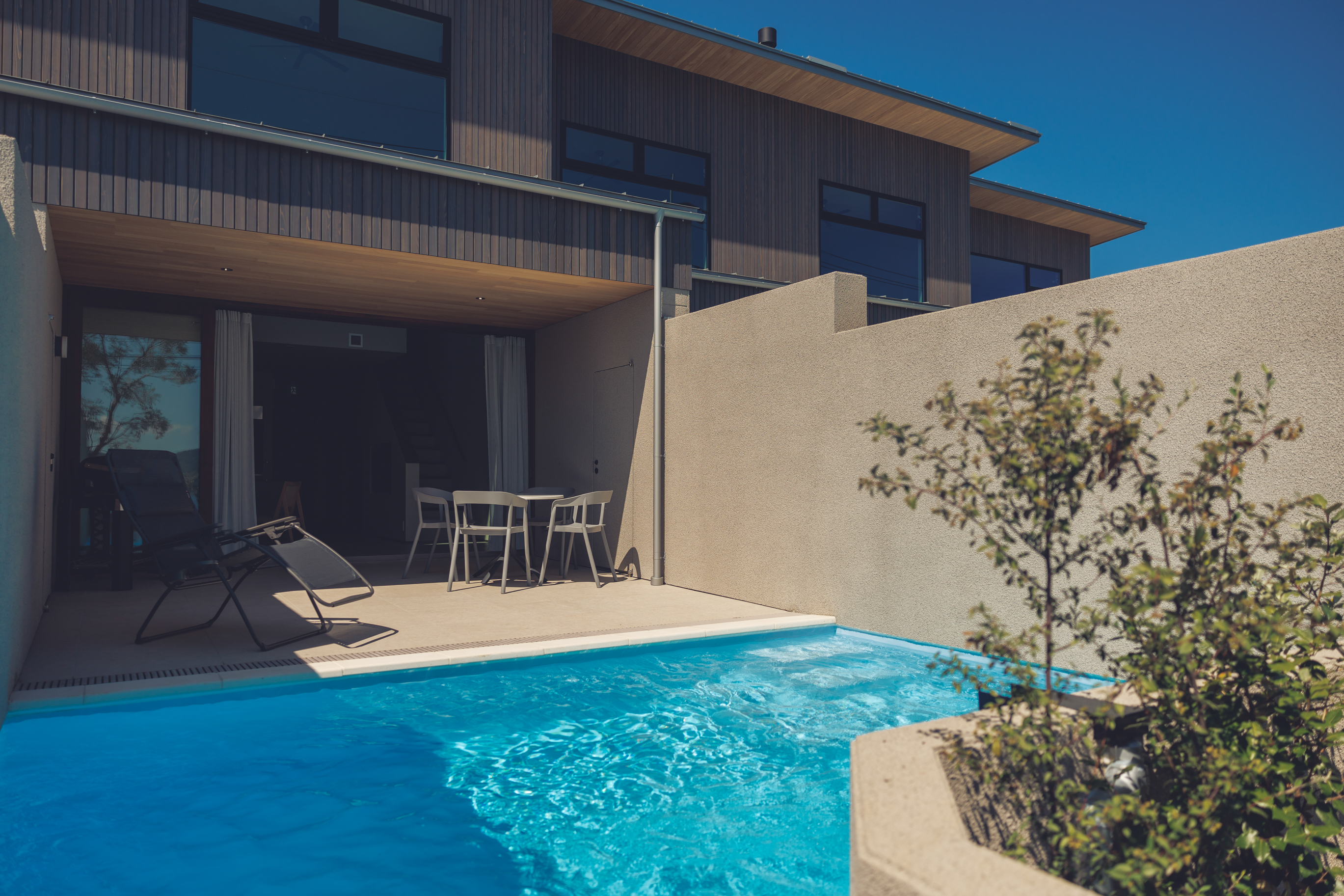 テラスの先に子供が遊ぶには良いサイズのプライベート温水プールを備えています。屋根付きのテラスにはデッキを備えているため日差しを気にすることなく子供達が遊ぶ姿を見守ることができますよ。